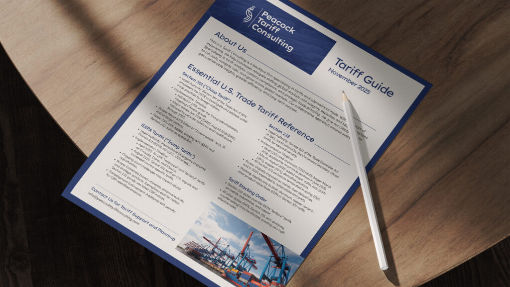 With over 20 years of experience, Peacock Tariff Consulting helps businesses navigate international trade with expert tariff reviews, compliance guidance, strategic planning, and refund support.